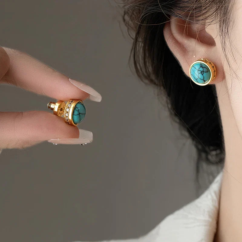 "Elegant 2025 Chinese-style retro earrings featuring natural turquoise stones and micro-inlaid zircon accents. These stud earrings bring a touch of traditional charm with a modern twist, perfect for adding a unique flair to any outfit."